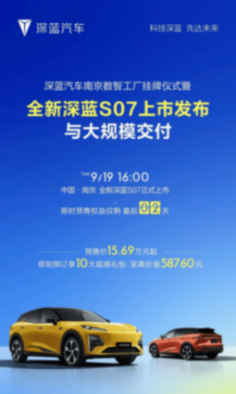 新款深蓝s07将于9月19日上市 双动力布局-凯发k8国际首页登录