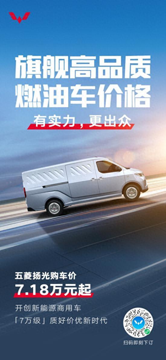 油电同价,电车越开越省!五菱扬光助力创富路上省钱更省心 新一代创富者,每一笔钱都要用在刀刃上,五菱扬光专为踏实勤恳的创富者而来。为满足更广泛的新能源商用车市场需求,让每个人都能用上新能源车,五菱扬光7.18万元起,定价几乎仅为部分业内同级产品的一半,颠覆行业价格,直抵同级别燃油商用车价格,让用户买得起,用得省。 “扬光之下无套路” ,用车方面,五菱扬光更是为用户“省”到骨子里。通过五菱纯电架构、“五菱红1号电池”等多项技术升级,五菱扬光进一步降低能耗,极大降低车辆使用、维修成本,让用户用得更省! 据测算,倘若用户每年驾驶五菱扬光行驶4万公里,对比油车五年可省下约70000元(测算按油车公里成本:7l/100km*8元/l=0.56元/公里;电车公里成本:0.5元/度,0.07元/公里,结合平均保险、补能及保养费用进行计算),相当于5年可省出一辆全新五菱扬光。