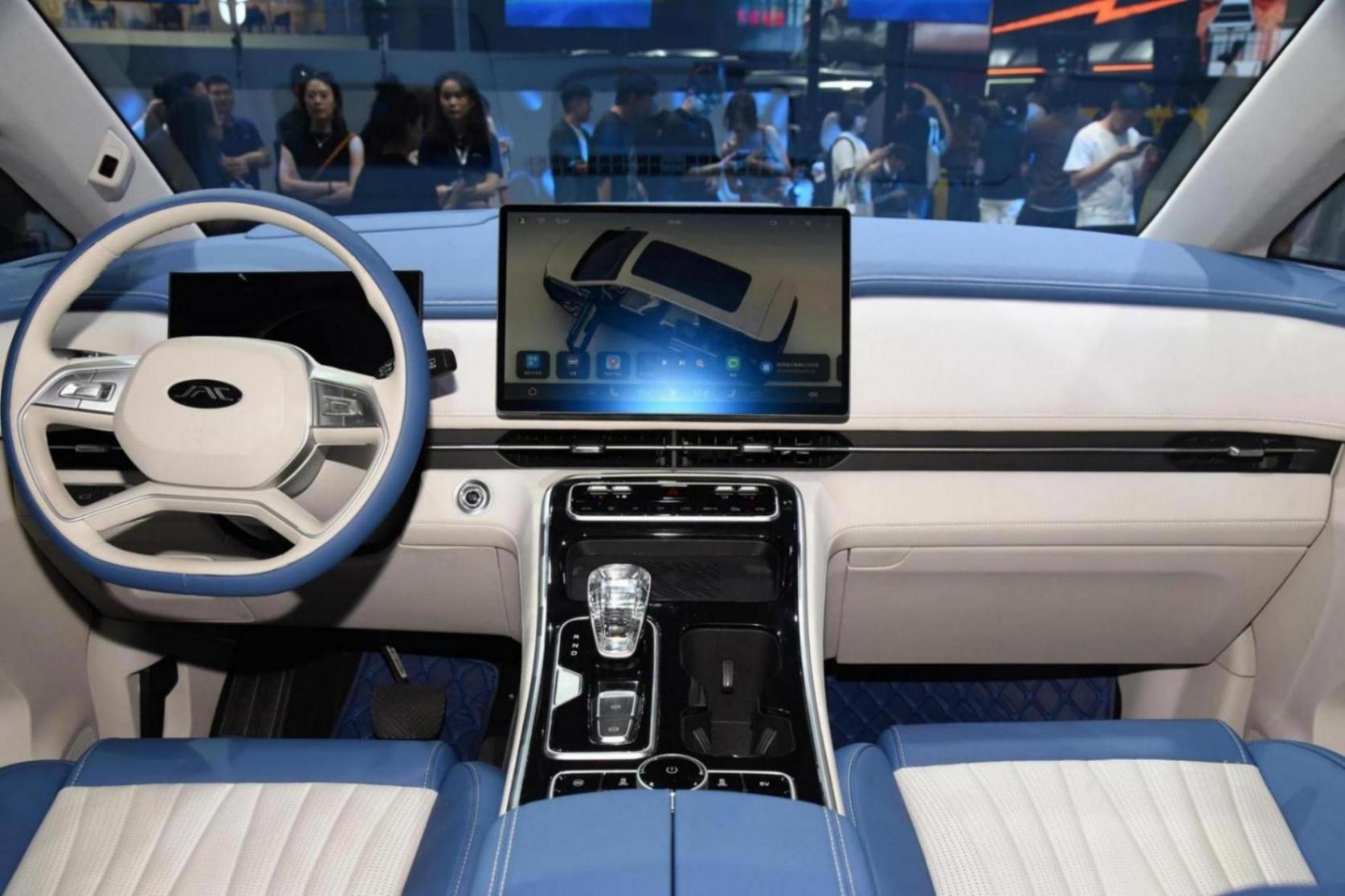 车尾部分,贯穿式的尾灯依旧粗壮,有着复杂的光源造型,车顶有着大尺寸扰流板,后保险杠部分再度突出,双层镀铬装饰形成呼应,让整车的风格形成统一,在内饰部分透过车侧已经可以看到鸿蒙版的悬浮式大尺寸液晶屏设计理念,双大屏设计也是所有鸿蒙座舱车机的共同样式,看来是华为统一的标准,与此前智聆版的贯穿式大屏截然不同,显得更加简洁,突出车机的内容,其他部分根据此前的车展图片,比如江淮风格的四幅方向盘,精致的电子挡杆等元素都不会缺席。