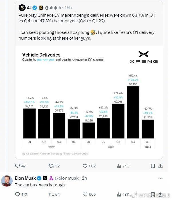 4月23日,cnmo了解到,据“环球市场播报”报道,一位x(前身是推特)用户发帖称,小鹏汽车今年第一季度交付量环比下跌63.7%,同比下降了47.3%,并指出,与小鹏以及其他一些竞争对手相比,特斯拉第一季度交付数据(环比下降20.1%,同比下降8.5%)还是不错的。马斯克回应称:“汽车这门生意真的很难。”