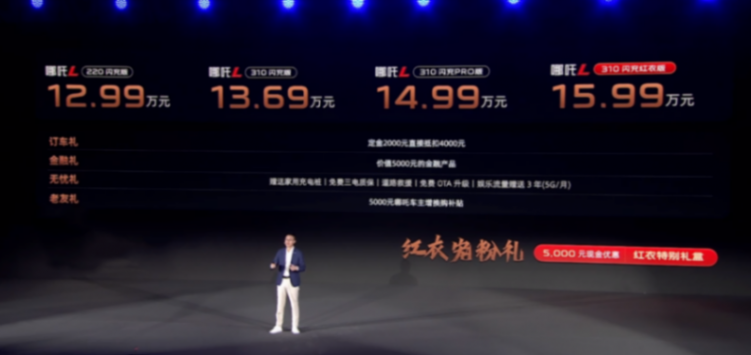 4月22日,哪吒汽车旗下全新产品——哪吒l正式宣布上市,本次新车共推出4个车型版本,其指导价为12.99万-15.99万元,值得一提的是,当前12.99万元的220闪充版目前仅属于公布了售价,而该版本车型预计会在8月份才会正式上市。