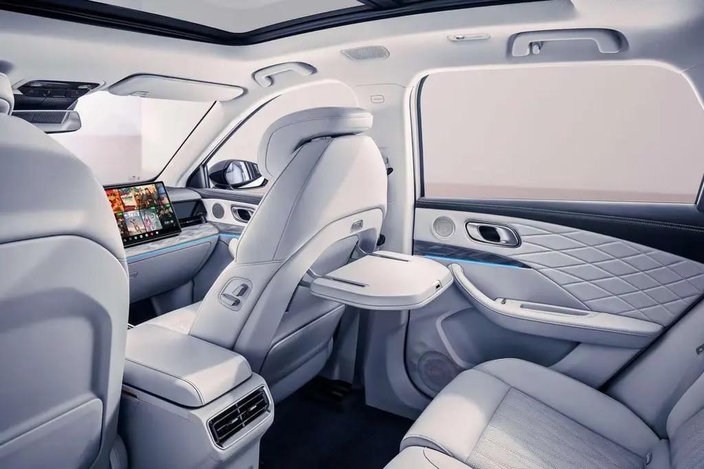 哪吒l增程版的内饰主打的科技感和豪华感,车内是配备了全液晶仪表盘和双15.6英寸的中控屏和副驾驶娱乐屏,方向盘为平底的三辐式多功能造型,科技感是做得非常出色的。值得一提的是,不止是理想汽车,哪吒l也是给到了冰箱、彩电和大沙发,不仅如此,它的车载冰箱是采用双开门的设计,制冷温度可达零下6度,大沙发则是带有8点按摩零重力功能。