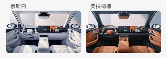 内饰方面,新车提供慕斯白和美拉德棕两种选择,采用15.6英寸中控屏,顶配和次顶配车型提供全车双层玻璃、64色氛围灯、16扬声器音响、面部识别、二排小桌板、前排座椅加热记忆通风按摩等配置,而15.6英寸副驾娱乐屏、6.6l车载冰箱和多指飞屏操控为顶配独有。