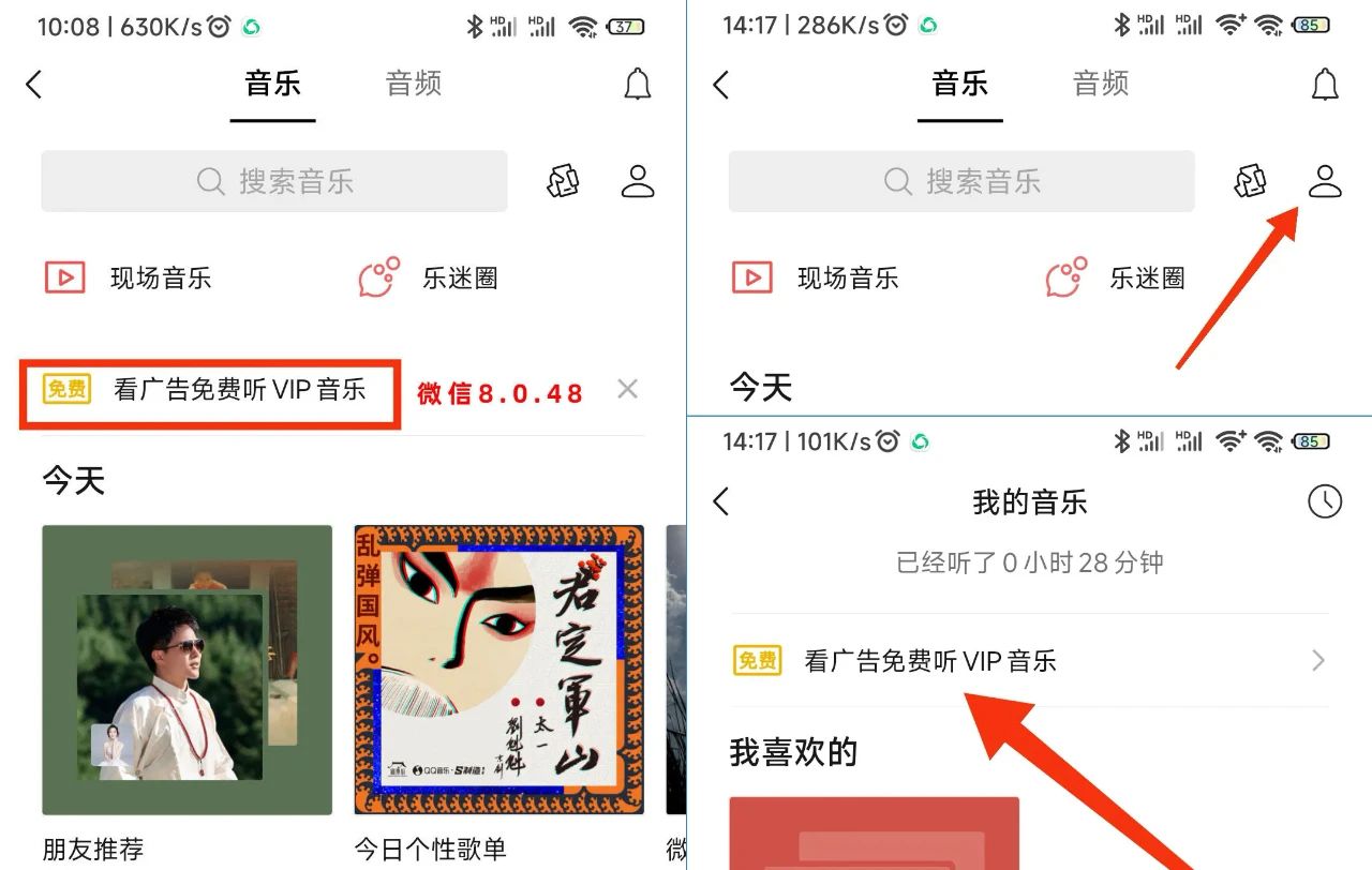 为了推广自己的qq音乐,微信在【听一听】中设置了一个“看广告免费听vip音乐”的功能。在旧版本中只要进入【听一听】就可以看到这个入口,但是在最新的微信8.0.49安卓正式版中,微信官方团队对这个功能的入口进行了迁移,由之前的【听一听】凯发k8国际首页登录首页移动到了【音乐】标签下【我的音乐】里面。