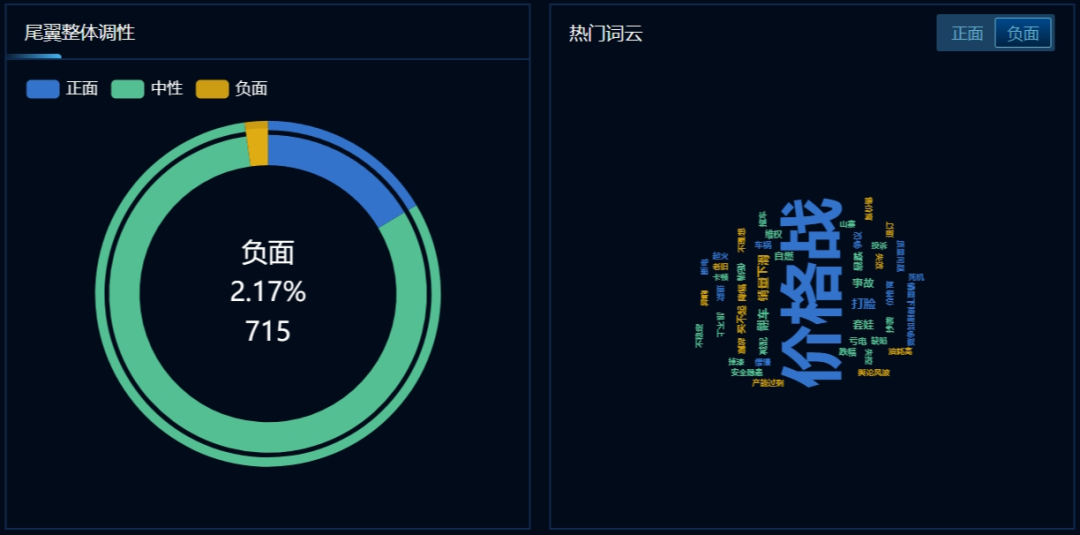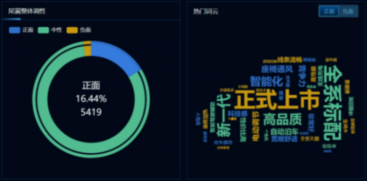 网友对这款车中性态度占比81%,正面态度占比16.4%,正面评价热门词主要有:全系标配、高品质、智能化、宽敞舒适等;负面评价占比2.2%,主要热门词为:价格战、销量下滑、套娃、减配等。