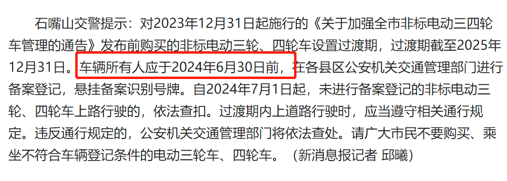 为了加强市场在用非标电动三、四轮车管理,规范车主出行,此前石嘴山相关部门对非标电动三、四轮车设置了过渡期政策。所有非标电动三、四轮车均需要在2024年6月30日之前完成备案登记,悬挂备案标识牌后上路。从2024年7月1日开始,发现未备案登记的非标电动三、四轮车上道路行驶,一律依法查处。