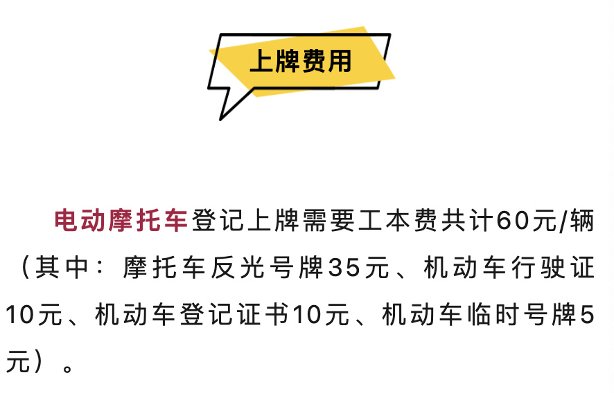 根据滁州交警官微显示,当地电动摩托车上牌费用共为60元,其中包括反光号牌35元、机动车行驶证10元、机动车登记证书10元、机动车临时号牌5元。全国上牌价格差异不大,大家可供参考。