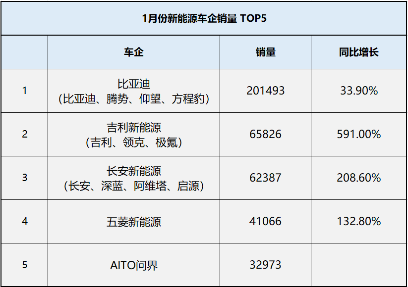 吉利在新能源板块的表现尤其亮眼,1月销量达到了6.58万辆,不仅取得全国新能源市场销量亚军,同比增速还达到惊人的591%,远超比亚迪、长安新能源、长城新能源等主流车企对手。