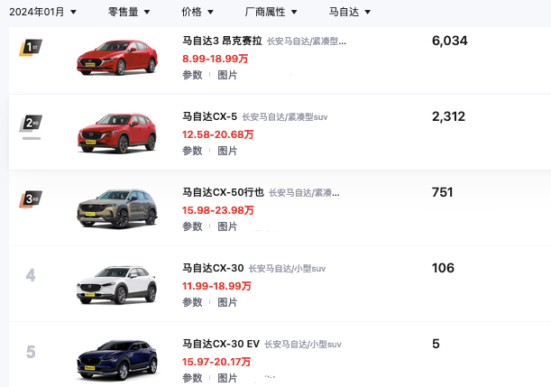 回看上个月,长安马自达在月初推出了全系车型限时优惠活动,而在二月,长安马自达发出了一月的销量成绩,2024年1月销量达到12393辆,相比上一年八九千的销量确实是好了些,但整体也是展现出疲弱的状态,单月销量也不如别人一台车一个月的销量。其中也有些原因也是来自于上一年马自达6阿特兹和cx-4停产的原因,在2022年中,阿特兹全年就能卖出19502辆,但随着时代变化也逐渐变成了几百台,到最后只能面临停产,如今只能靠着昂克赛拉的销量去支撑。难道马自达没有其他车型吗?有的,但效果微弱。在今年1月,除了卖出六千多台的昂克赛拉以外,还有卖出2312辆的二把手cx-5,剩下的cx-50和cx-30分别为751辆和106辆,对于月销量成绩来说杯水车薪。