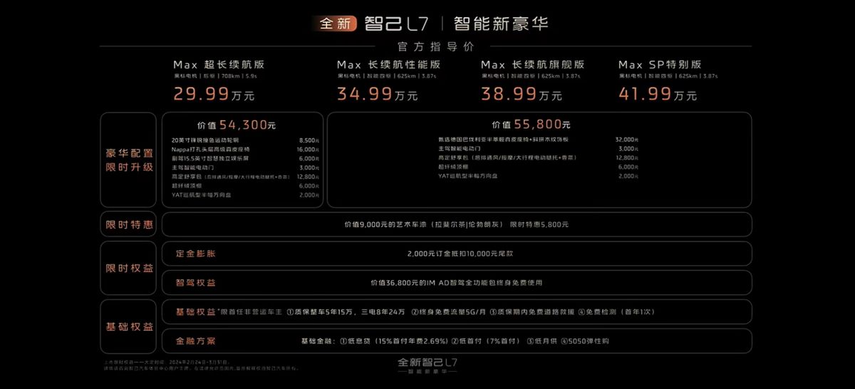 增配降价的同时,全新智己l7在权益方面也很给力。即日起至3月31日,下定全新l7车型,最高可以获得63800元的限时购车好礼,包括交2000元订金抵扣10000元尾款,以及多项豪华配置升级特惠,还有im ad智能驾驶全功能包终身免费使用等。