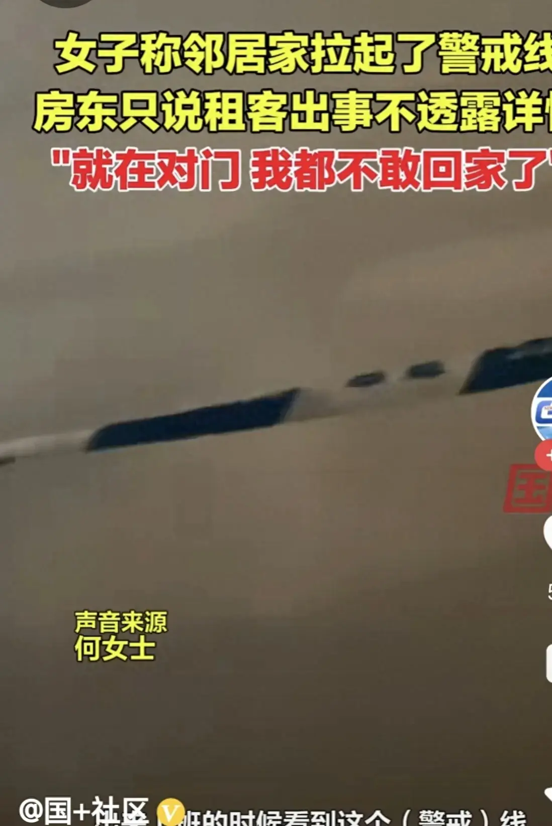 事情是这样的,近日在广东的一个女子曝光,自己家对门邻居家被拉警戒线了,而且是蓝色的,自己也不知道发生了什么事情,通过询问房东,房东不想过多解释,只是说出了一点事情,并没有说个啥,这让女子很害怕!就曝光了这件事。