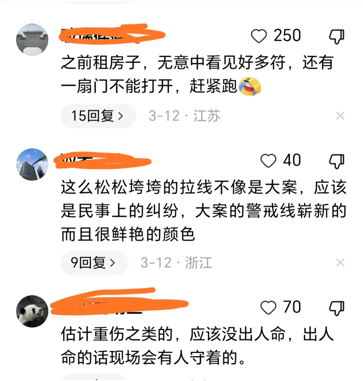 这件事被曝光以后,网友不淡定了。大家就纷纷留言自己的想法!有网友说,这个拉警戒线涉及的问题比较严重,并不是一般的案件。还有网友分析,也许没有那么严重,是正在办理案件而已。这件事和房东也没有啥关系,是因为房东的租客出了事情,所以才把房子给拉警戒线了。大家各说各的,评论区很热闹。