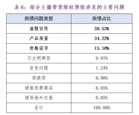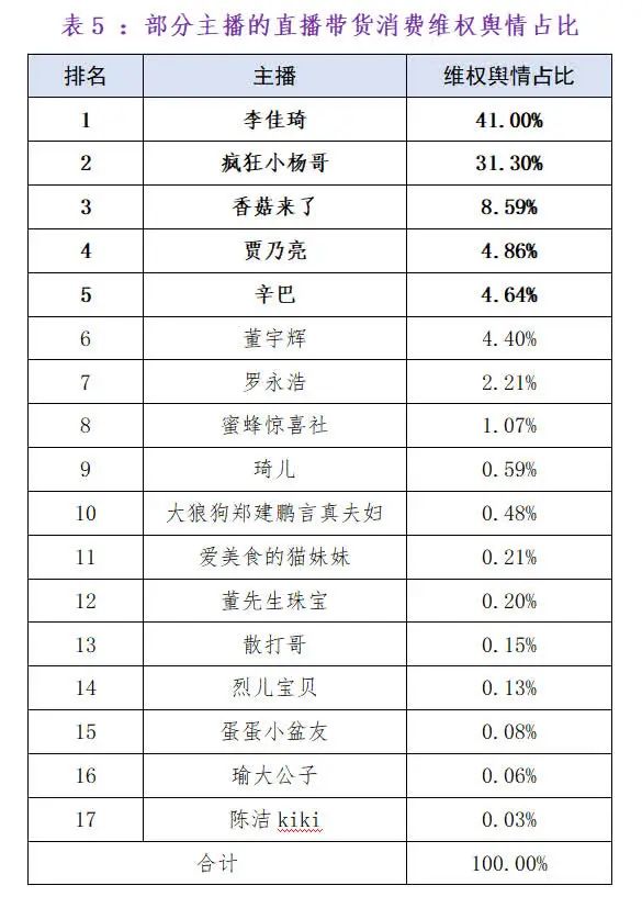 《报告》中指出,在对17位主播的直播带货消费维权舆情数据分析后发现,涉及李佳琦的维权舆情最多,占比高达41.00%。其中,李佳琦的产品质量舆情更突出,疯狂小杨哥和辛巴的不文明带货问题舆情较为突出,贾乃亮和辛巴的发货问题舆情较为突出。