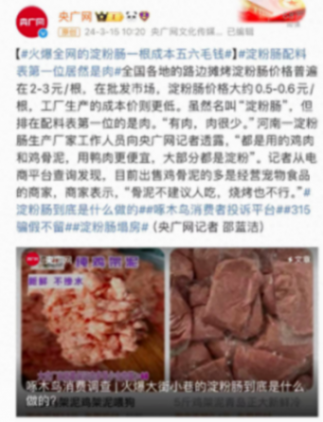 淀粉肠配料被曝光后,#淀粉肠塌房#、#淀粉肠塌房不该被大家轻易原谅#、#鸡骨泥#等多个话题在热搜榜持续发酵,不少消费者直呼“再也不敢吃了”。