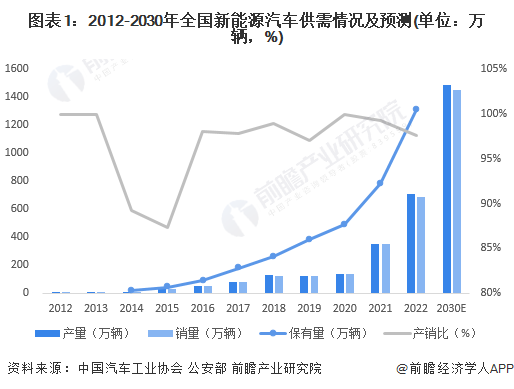 新能源汽车是我国应对气候变化、推动绿色发展的战略举措,在政策和市场需求的推动下,我国新能源汽车产销量保持高速增长,2022年,全国新能源汽车实现产量705.8万辆、实现销量688.7万辆;同时,据公安部数据显示,截至2022年末,全国新能源汽车保有量已达1310万辆,占汽车总量的3.14%。根据国务院印发的《新能源汽车产业发展规划(2021-2035年)》,未来几年我国新能源汽车行业仍将保持高速发展态势,至2025年,新能源汽车新车销售量达到汽车新车销售总量的20%左右,至2030年,预计销量将突破1400万辆。