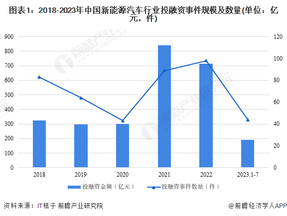 2022年,中国新能源汽车行业投融资事件数量达98件,投融资金额为713.93亿元。2023年1至7月,行业投融资事件数量为44件,投融资金额为189.58亿元。