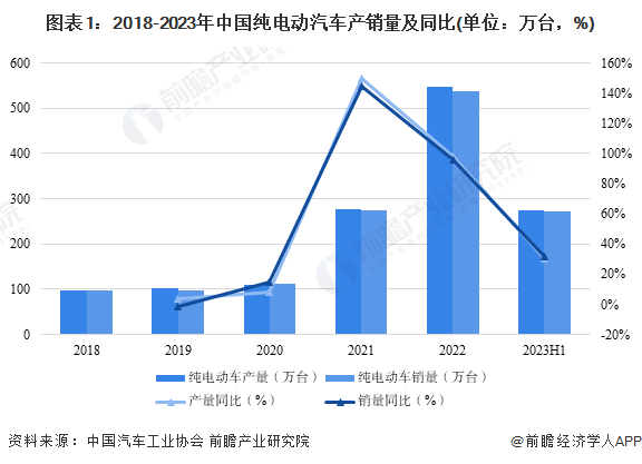 2018-2022年,我国纯电动车市场快速发展,纯电动车产销量同步快速提升。2022年全年,我国纯电动汽车产量546.7万台,同比增长98.01%;销量536.5万台,同比增长96.23%。相比2018年,我国纯电动汽车产销量翻了五倍多。2023年上半年,我国纯电动汽车产销量分别为274.7万台、271.9万台,相比2022年同期分别增长30.3%和31.9%。